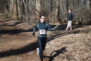 (Trying to avoid twisting an ankle at the Tyler Arboretum trail race on March 27, three weeks before the marathon. Photo: John Greenstine.)